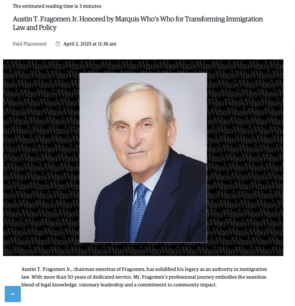 Mr. Fragomen appeared in the Florida edition of the Wall Street Journal on August 19, 2025 to announce his status as a Marquis Distinguished Leader.