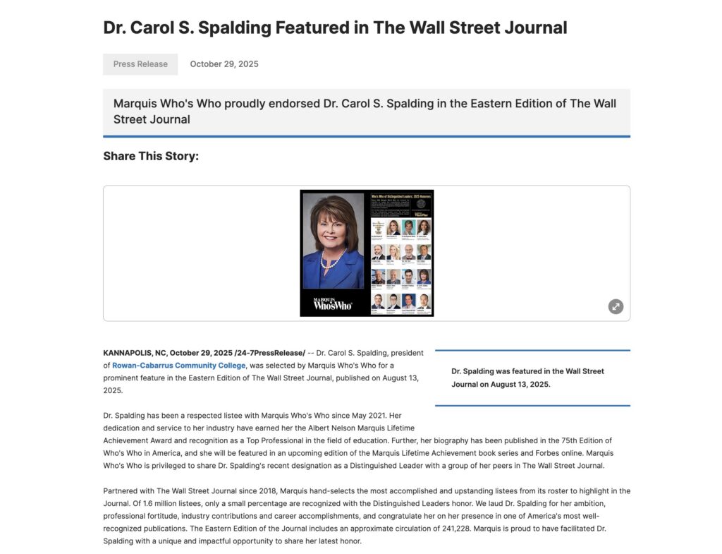 Dr. Spalding appeared in the Wall Street Journal among a select group of her Marquis peers. A national press release promoted her selection.