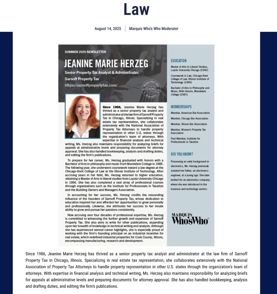 Jeanine Marie Herzeg is a senior property tax analyst and administrator at Sarnoff Property Tax, where she celebrates nearly 40 years of professional distinction. She began working with the firm in 1986 as a law student at the Illinois Institute of Technology. Initially hired to review legal briefs, her analytical skills and clear writing set her apart, and she remained on staff as a property tax administrator. She specializes in real estate tax representation, collaborating with the National Association of Property Tax Attorneys, and handles tax projections, reviews of purchases, and appeals.