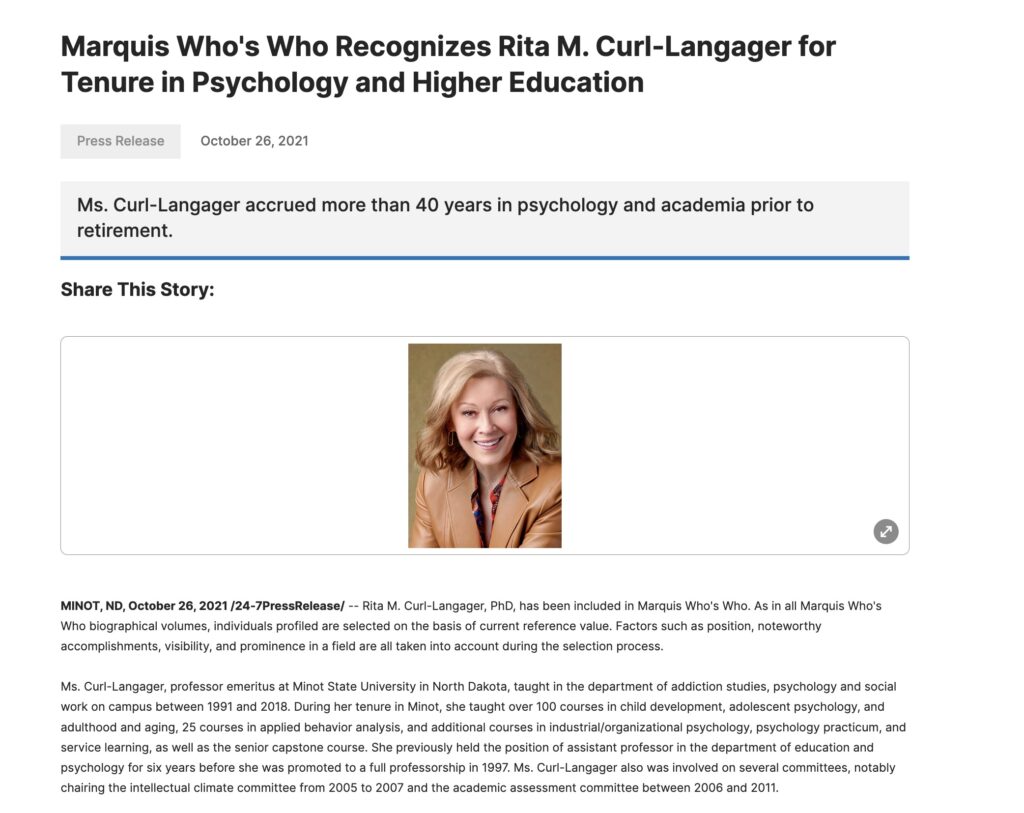 A nationally-distributed press release celebrates Dr. Curl-Langager’s induction into the Marquis Who’s Who biographical registry.